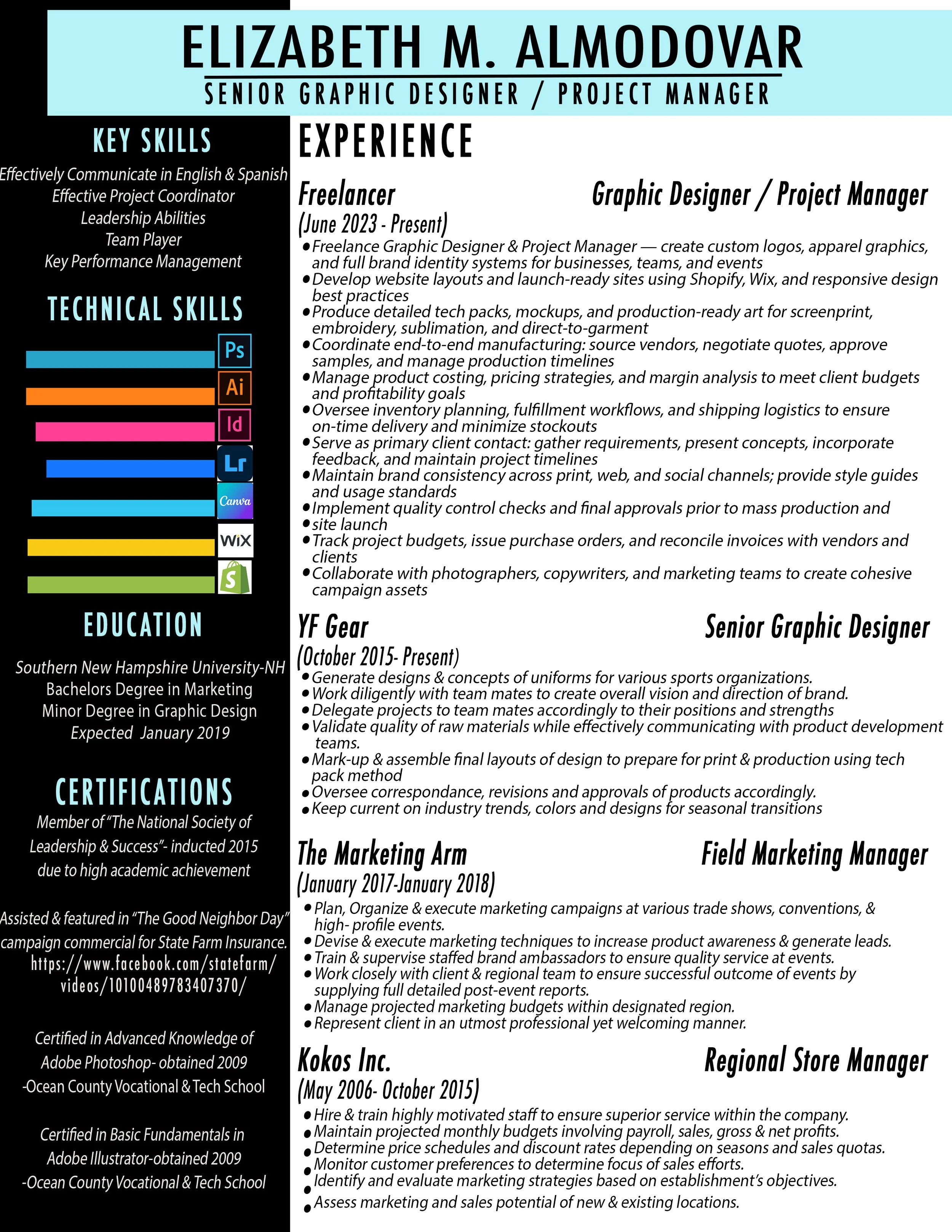 Creative, bilingual (English/Spanish) Graphic Designer and Project Manager with over a decade of experience designing brand-forward visuals, leading cross-functional teams, and executing integrated marketing campaigns. I combine strong art-direction and UI/UX fundamentals with hands-on production skills (Adobe Photoshop, Illustrator, Shopify, Wix) to take concepts from brief to polished deliverables for print and web.